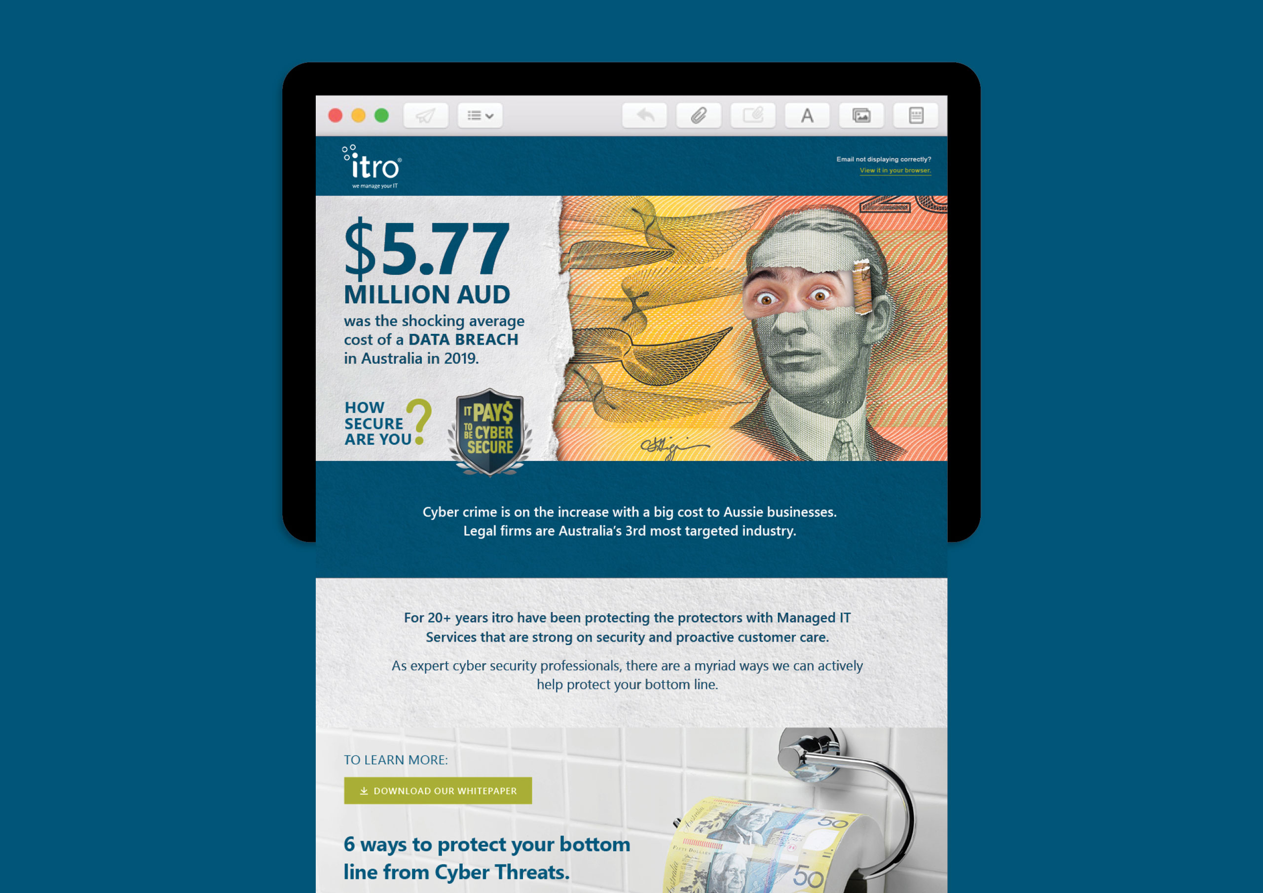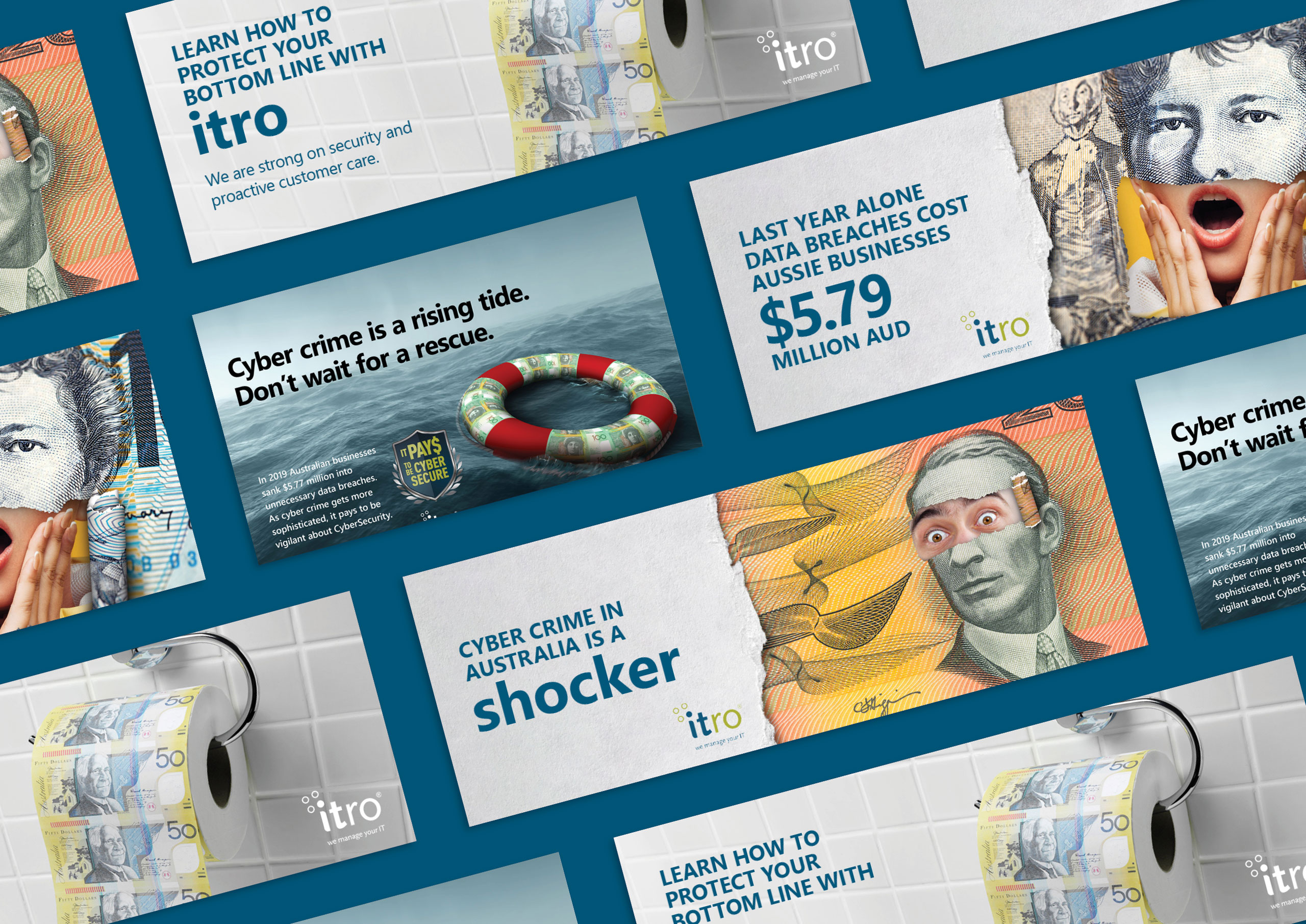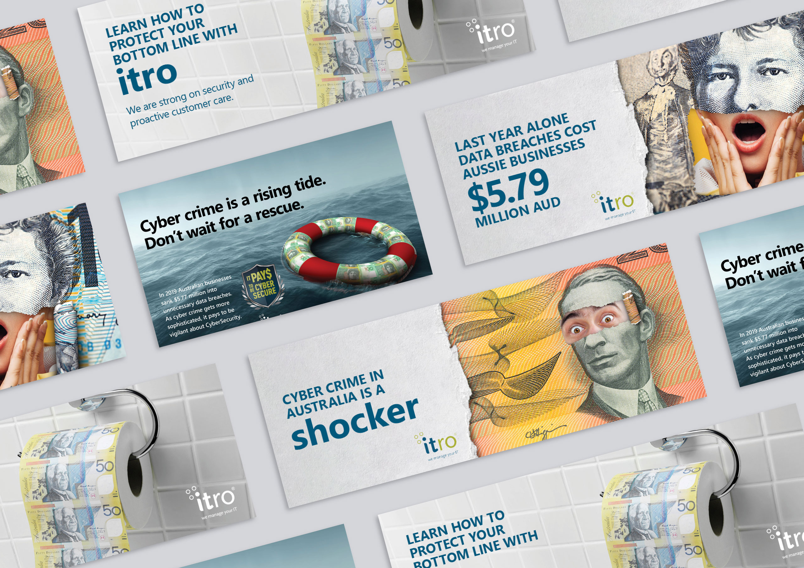 To convey the importance of cyber security in a provocative, unique way we made this rather dry topic engaging, using the concept of money and shocking statistics to talk to the campaign idea: It Pays to be Cyber Secure! Photoshopped currency was the hero and a tongue in cheek humorous approach was taken to underscore the savings to be made by prioritising cyber security.